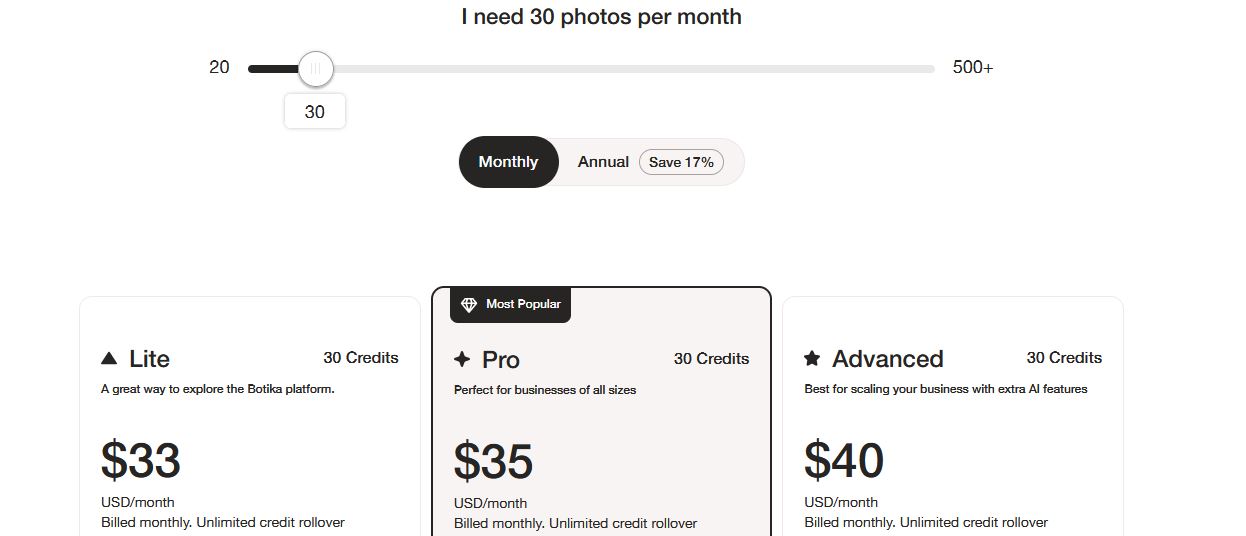 Pricing: Botika.io has a free trial option (what I used). Then if you subscribe, the pricing per generation is around $1 depending on your subscription. This includes 2k resolution and .
