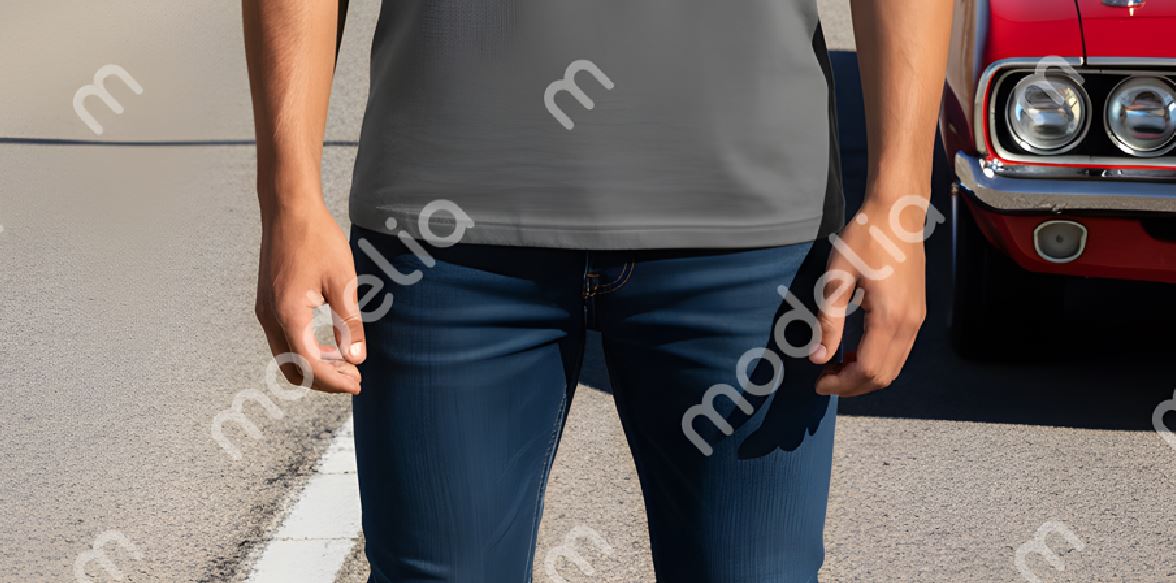 Process: For the test, I uploaded the grey t-shirt and then wrong a description of the jeans I want to pair it with and the background. You can choose from present models, or create your own that you can save for repeated use as well